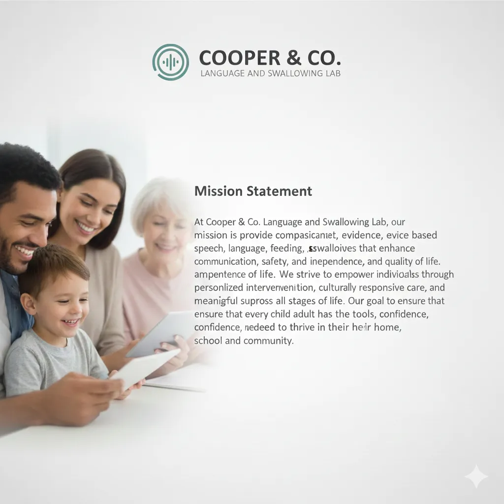 At Cooper & Co. Language and Swallowing Lab, our mission is to provide compassionate, evidence based speech, language, feeding, and swallowing services that enhance communication, safety, independence, and quality of life. We strive to empower individuals and families through personalized intervention, culturally responsive care, and meaningful support across all stages of life. Our goal is to ensure that every child and adult we serve has the tools, confidence, and voice needed to thrive in their home, school, and community.At Cooper & Co. Language and Swallowing Lab, our mission is to provide compassionate, evidence based speech, language, feeding, and swallowing services that enhance communication, safety, independence, and quality of life. We strive to empower individuals and families through personalized intervention, culturally responsive care, and meaningful support across all stages of life. Our goal is to ensure that every child and adult we serve has the tools, confidence, and voice needed to thrive in their home, school, and community.